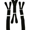 Black Trouser Braces with Black Leather Ends. A high class pair of men's button fastening vintage style trouser braces. Add a smart finishing touch with these comfortable stylish adjustable braces. These Y-style braces are woven from 3.5cm-wide elasticated fabric, with black leather fasteners and plain chrome-coloured adjustment bars