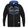 The LINGARD - D555 Full Zip Hoody in bold black. This stylish hoody combines the best of comfort and durability with its cotton-polyester fabric blend. The original chest print adds a unique flair to your look, making it suitable for both casual outings and relaxed evenings at home