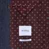 Features include slanted flap pockets with faux suede trim, geometric print lining, pull-out pocket hankie with twin side vents.