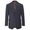 Thoresby suit in navy / grey windowpane check stretch fabric with peak lapels.